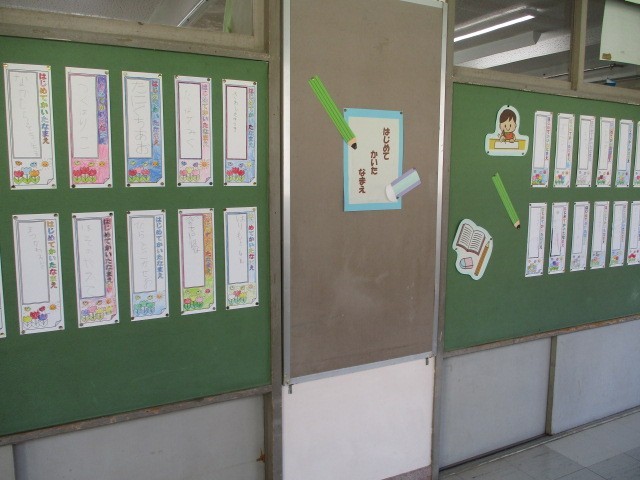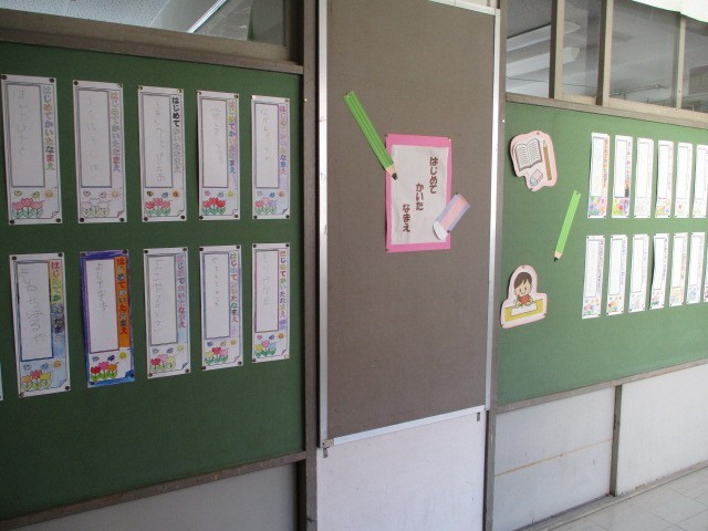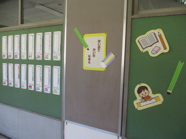 1年生の教室前に、初めて書いた名前が貼られています・・・
