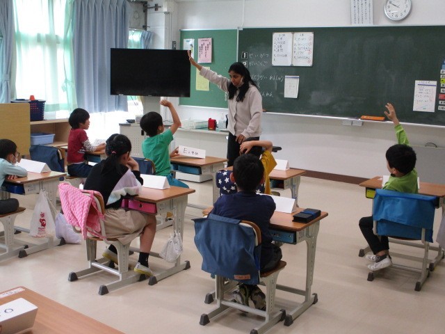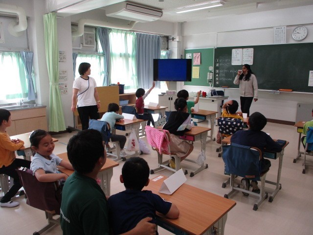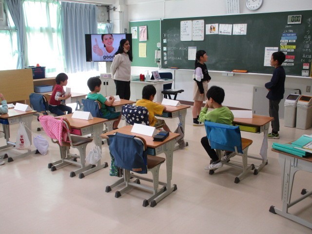 担任の先生とALTの正医師と一緒に外国語活動です。