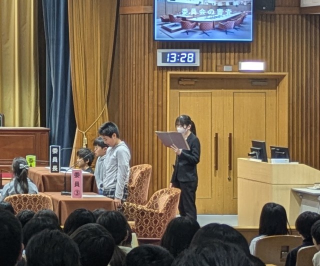 「未成年者喫煙・禁酒法改正案」について委員会が始まりました。各校代表の友達が前に出ているため、皆静まり返り食い入るように見つめています。国会は何をするところなのか、法律はどのようにできるのか学んでいます。