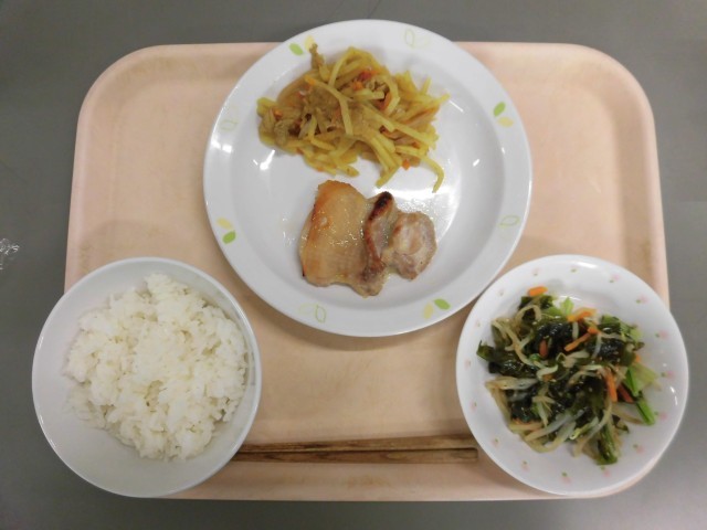 有機米ごはん 鶏肉の塩麹焼き カレーきんぴら もやしとわかめのごまじょうゆ 牛乳