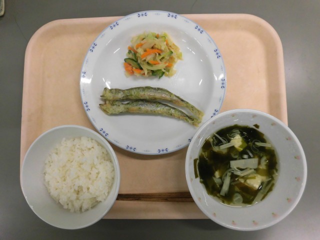 有機米ごはん ししゃものいそべ揚げ みそドレッシングサラダ 若竹汁 牛乳