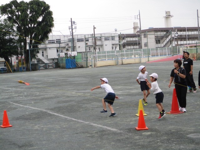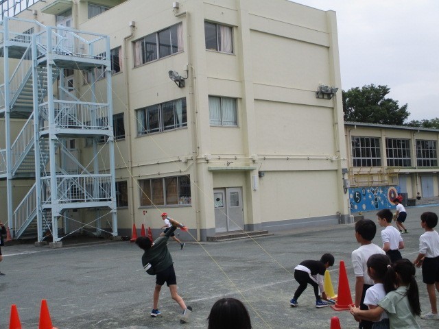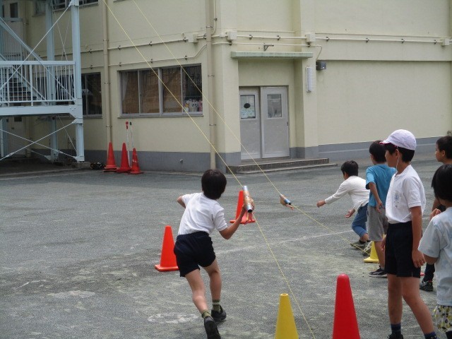 運動遊び~ 公開日 2025/06/02 更新日 2025/06/02 今日のできごと 投げる力の向上に向けて、期間限定の遊び用具を設置しました~体育の時間や休み時間に、みんなで挑戦しています・・・・運動遊びでも、自己の取組目標を決め、自ら進んで運動に取り組む姿勢を育てていきたいです・・・・・