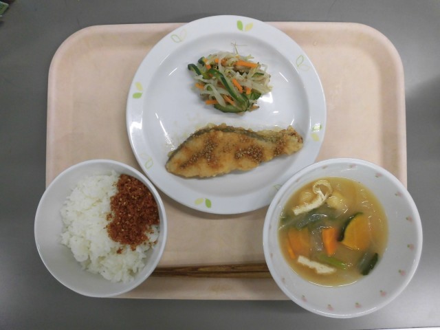 ごはん かつおでんぶ ホキのあずま煮 もやしのごま酢あえ かぼちゃのみそ汁 牛乳
