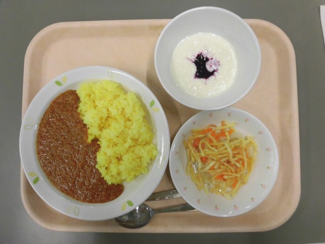 ターメリックライス キーマカレー じゃがいものハニーサラダ ヨーグルトのブルーベリージャム添え 牛乳