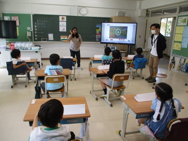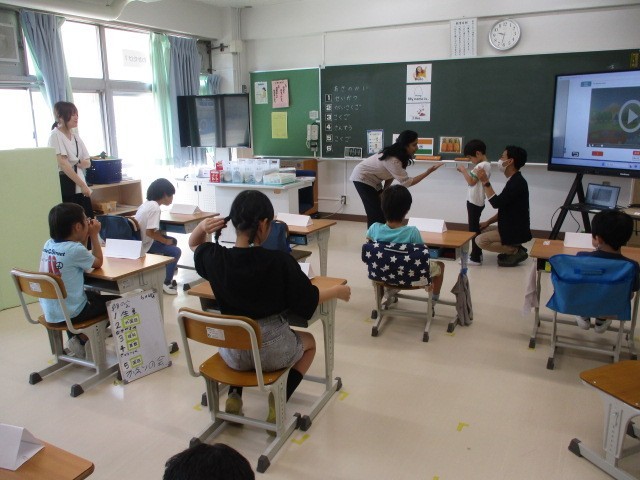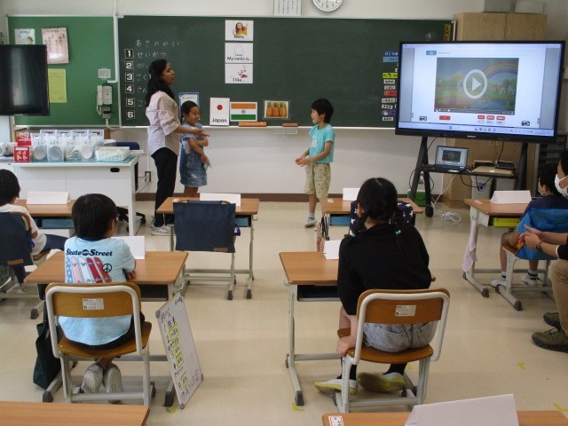 外国語活動~わかたけ学級 公開日 2025/06/06 更新日 2025/06/06 今日のできごと ALTの先生と担任の先生と一緒に外国語活動です。簡単な挨拶などの仕方について、みんなで学習しました~