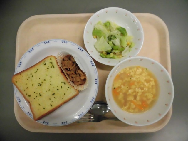 ガーリックトースト ポークチャップ 枝豆サラダ ふわふわ卵スープ 牛乳