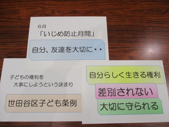 校長からは、特別支援が急の河口湖移動教室が実施されたことと、6月の「世田谷区いじめ強化月間」に合わせて、子どもが一人の人間として大切にされ、成長するために必要な子どもの権利を大事にしようという決まり「子どもの権利条例」があることを伝えました。