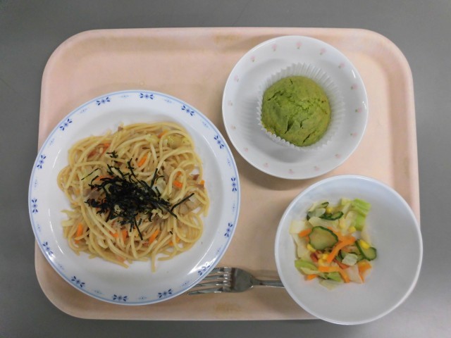 和風スパゲッティ 玉ねぎドレッシングサラダ 小松菜ケーキ 牛乳