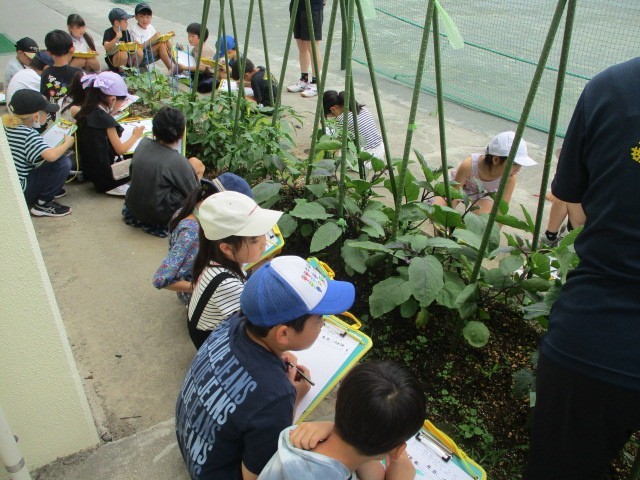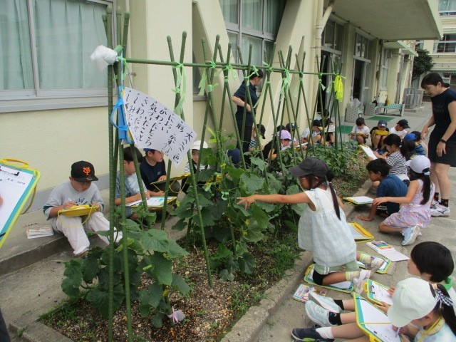 野菜をそだてよう~2年 公開日 2025/06/16 更新日 2025/06/16 今日のできごと 生活科の学習です。育てている野菜の観察をして、観察カードに記録しました~小さな「きゅうり」ができ始めていますね・・・・