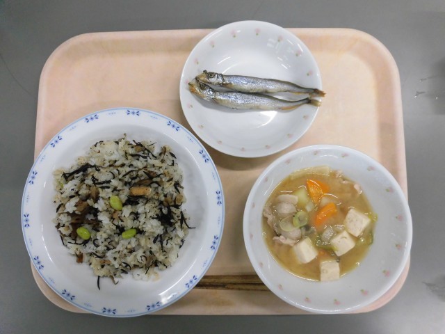 ひじき入り五目ごはん 焼きししゃも 豚汁 牛乳