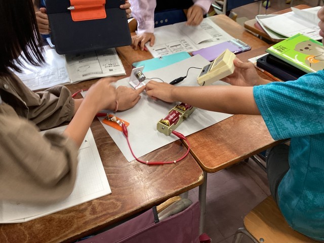 電池のはたらき 4年 公開日 2025/06/25 更新日 2025/06/25 今日のできごと 乾電池のつなぎ方と電流の大きさの関係について、班の友達と協力して器具を選び、実験しました。結果をもとに考察し、友達と意見交流しました。