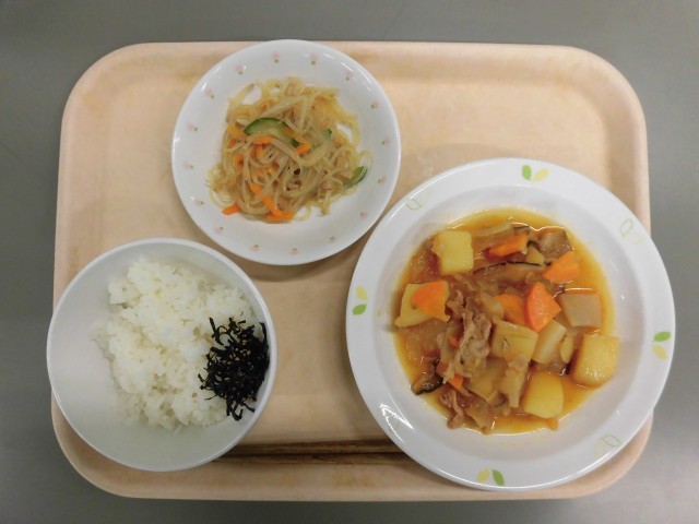 ごはん 韓国風ふりかけ 韓国風肉じゃが 春雨サラダ 牛乳