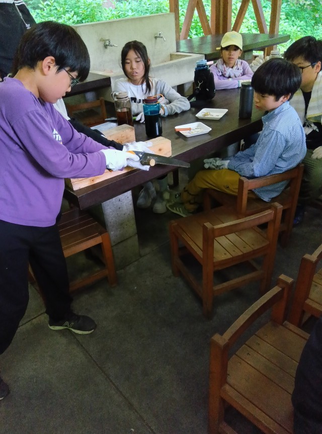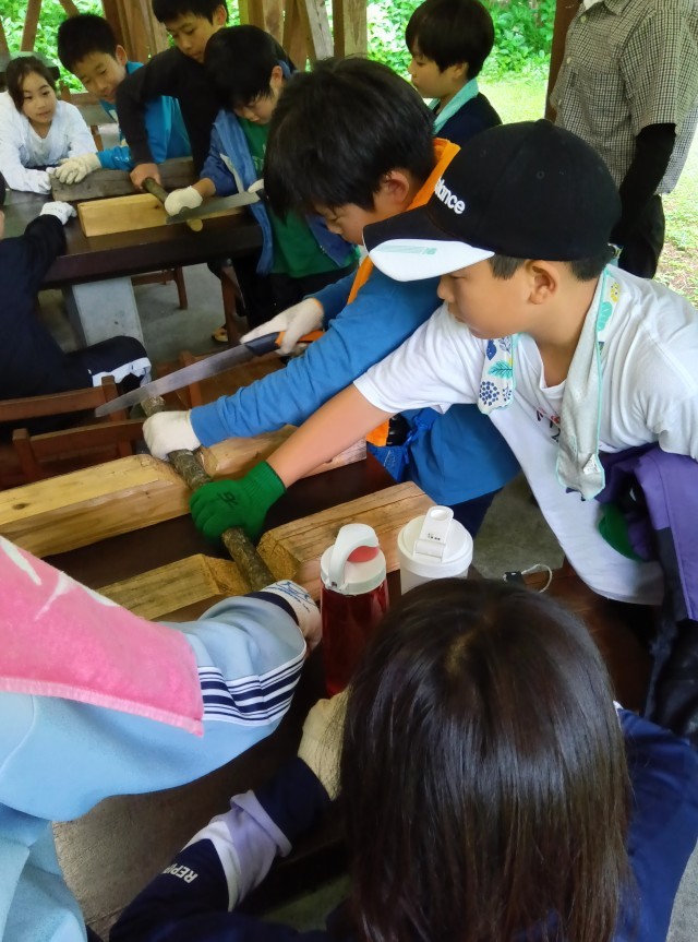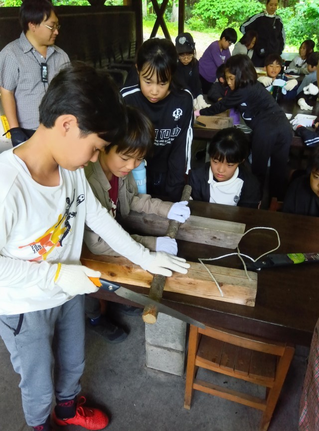枝をノコギリで切り、ストラップ作りに挑戦です〜