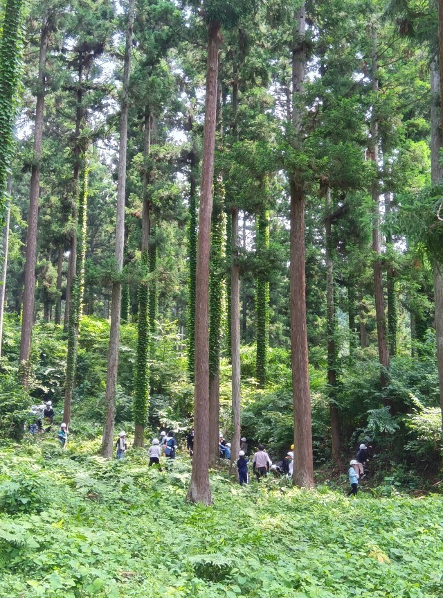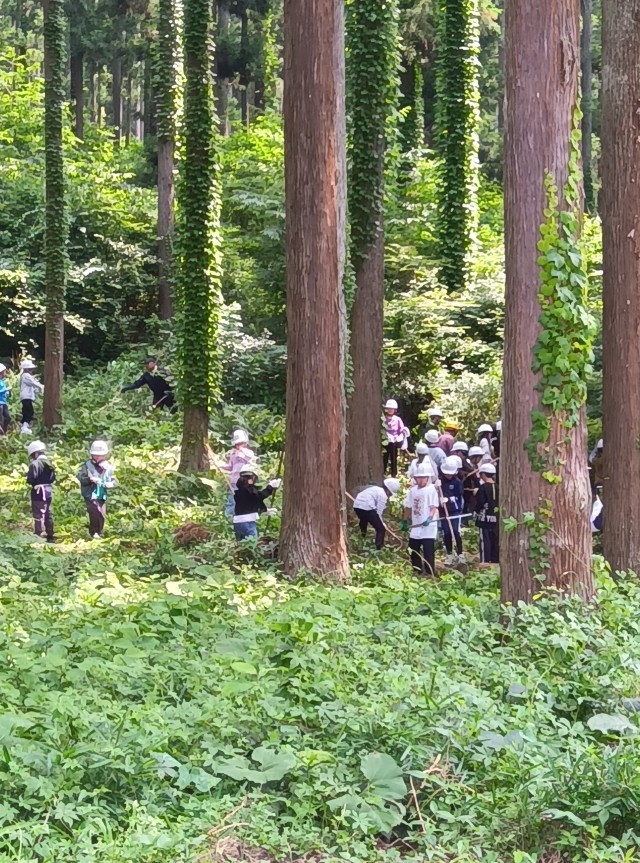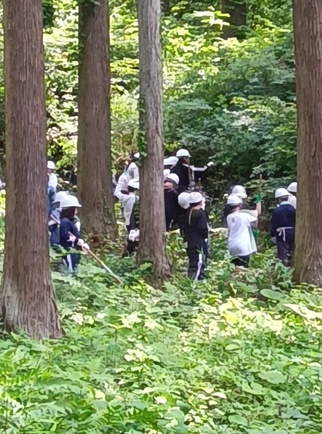 ヘルメットをかぶって森に入り、草や余分な枝を切る作業に挑戦しました〜