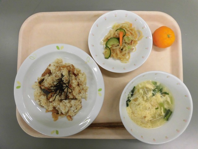 いわしごはん はりはり野菜 冬瓜と卵のすまし汁 冷凍みかん 牛乳