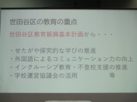指導主事の先生のお話を聞き、世田谷区の教育の重点などについて、3校の教員の交流活...