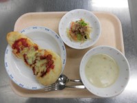 ナンピザ 焼肉サラダ 米粉のコーンポタージュ 牛乳