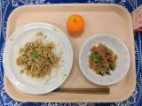 高野豆腐のそぼろ丼 牛乳 キャベツのあっさりあえ みかん 主な食材と産地 と...