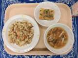 鶏ごぼうごはん 牛乳 いかのねぎみそ焼き 沢煮椀 主な食材と産地 とりひき肉...