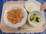 〜今日の献立〜 鮭のトマトクリームスパゲッティ 牛乳 ブロッコリーと コーンのサ...