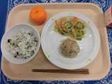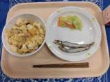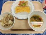 〜今日の献立〜 豚肉とごぼうのごはん 牛乳 五目卵焼き キャベツのおかかあえ す...