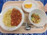 〜今日の献立〜 チリビーンズライス 牛乳 ごぼうチップサラダ くだもの (ネーブ...