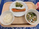 〜今日の献立〜 ごはん 牛乳 鮭の照りごま揚げ 青菜のおひたし さつま汁 〜...
