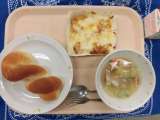 〜今日の献立〜 ミルクパン 牛乳 ペンネグラタン ベーコンと野菜のスープ 〜...