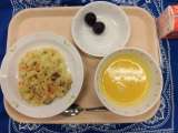 〜今日の献立〜 パエリア 牛乳 かぼちゃのポタージュ くだもの(きょほう) 〜...